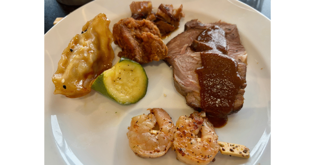 カレー、グラタン、サラダバーなど、世界各国の観光客に対応できる多様なメニューがありました。フィッシュアンドチップスや唐揚げもあって、こども向けも豊富。チリが効いた料理が多かったのは少し残念でしたが、家族旅行やグループ旅行でも安心ですね。