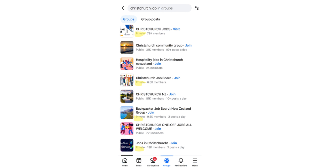 オーストラリアやニュージーランドでは、Facebookでのやり取りが一般的で、さまざまなグループが存在しています。例えば、グループの「探す」タブから『Christchurch Job』と入れるだけで数えきれないグループが出てきます。